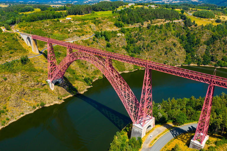Enjambant les gorges de la Truyère au niveau de Ruynes-en-Margeride, dans le Cantal, ce viaduc ferroviaire est l’un des plus remarquables de France. Son architecture toute en fer et acier, ainsi que sa courbe élégante, en font une prouesse d’ingénierie et un monument emblématique de la région. Mais ce sont sa longueur, 565 m, et sa hauteur, 122 m, qui le rendent vraiment unique : à son achèvement en 1884, le viaduc est alors le plus haut du monde… et celui ayant la plus grande portée !